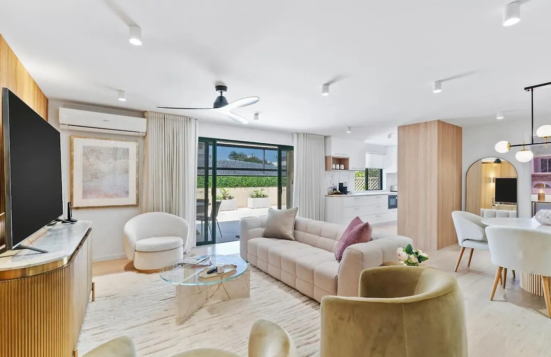 The spacious 108 m² C'Est Mermaid - A Stunning Beachside Escape Gold Coast apartment provides easy access to various city attractions, such as Ken Mansbridge Park, situated only a 5-minute walk away.
